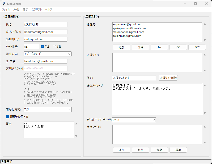 - アプリパスワード(Gmail の場合は 2 段階認証+16 文字パスワード、その他の SMTP サーバの場合は通常のパスワード)