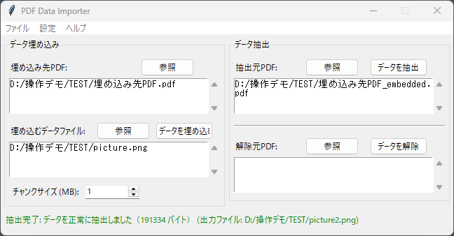 - 「抽出元PDF」フィールドにデータが埋め込まれたPDFファイルのパスを入力
